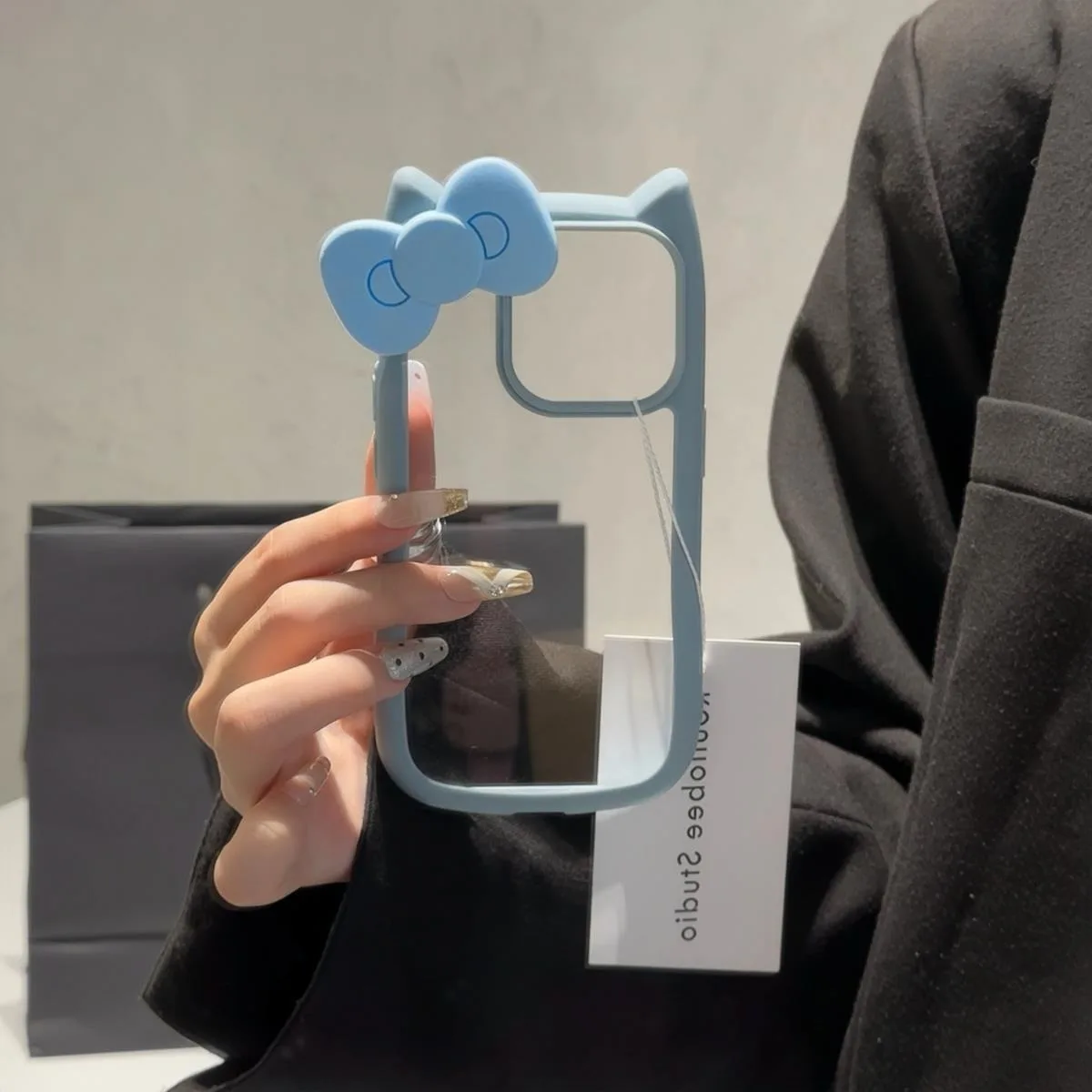 Cute Bowknot Silicone Cat Ear Case For iPhone 16 16E 15 14 Pro Max 13 12 11 Plus Clear Shockproof Hard Acrylic Bumper Back Cover